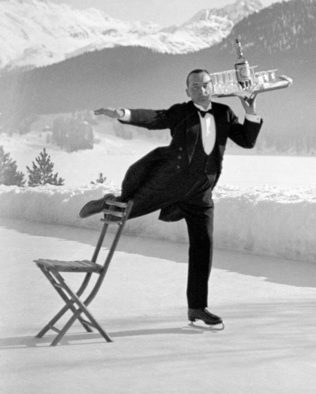 <p><b>Alfred Eisenstaedt</b>, <i>Ice Skating Waiter</i>, 1932. Skating waiter RenŽ Breguet delivers drinks at the Grand Hotel, St. Moritz.</p>