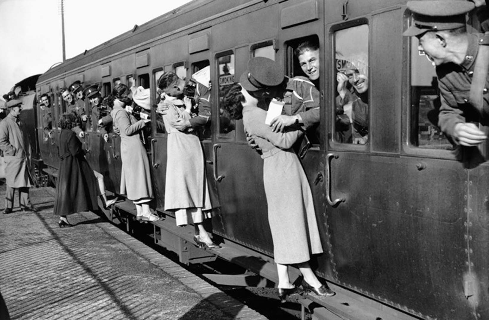 <p><b>Alfred Eisenstaedt</b>, <i>London, 1935. Soldiers departing for Egypt from Feltham Station lean out of their windows to kiss their loved ones goodbye.</i></p>