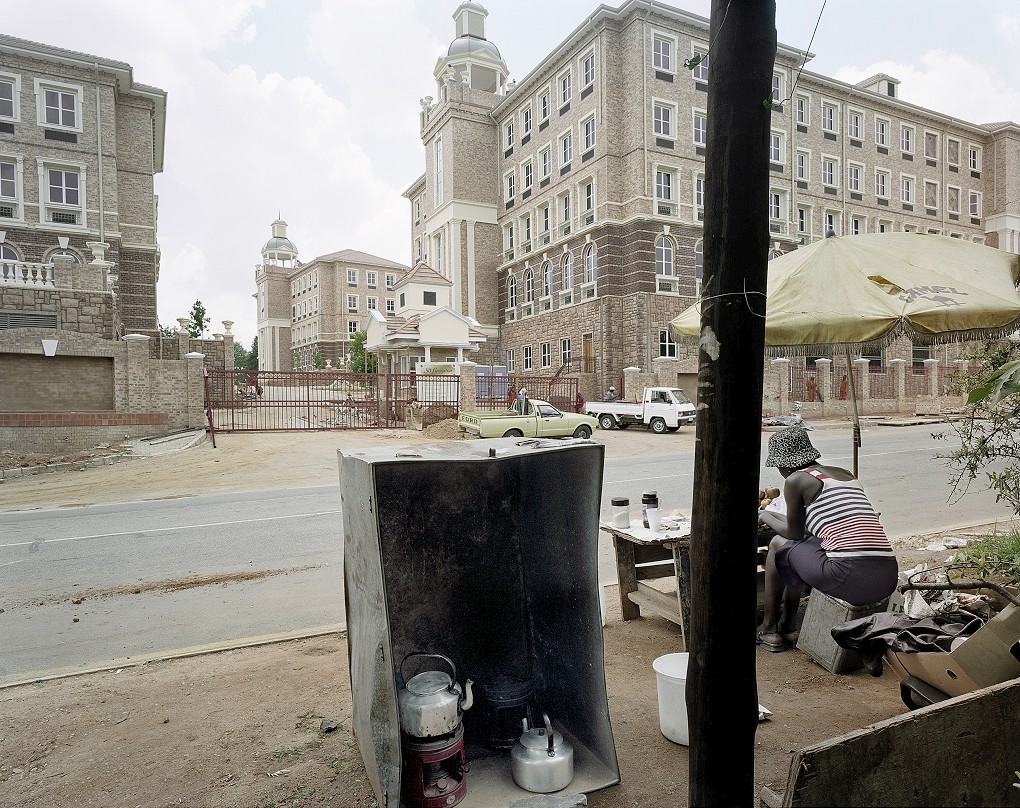 <p><b>David Goldblatt</b>, <i>Waiting to sell food to construction workers who are putting the finishing touches to 93 Grayston. Sandton, Johannesburg</i>, 2001.</p>