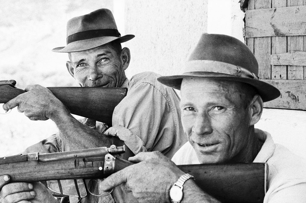 <p><b>David Goldblatt</b>, <i>The brothers Stappies and Kloot Cordier challenge me to a shooting competition. The target was a brown stone on a brown field about 50 metres away. As prize they put up a watermelon and I a couple of cans of beer. Gamkasfloof, Cape Province (Western Cape)</i>, December 1967.</p>