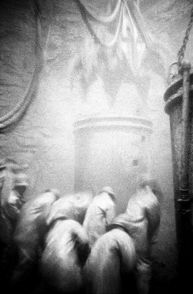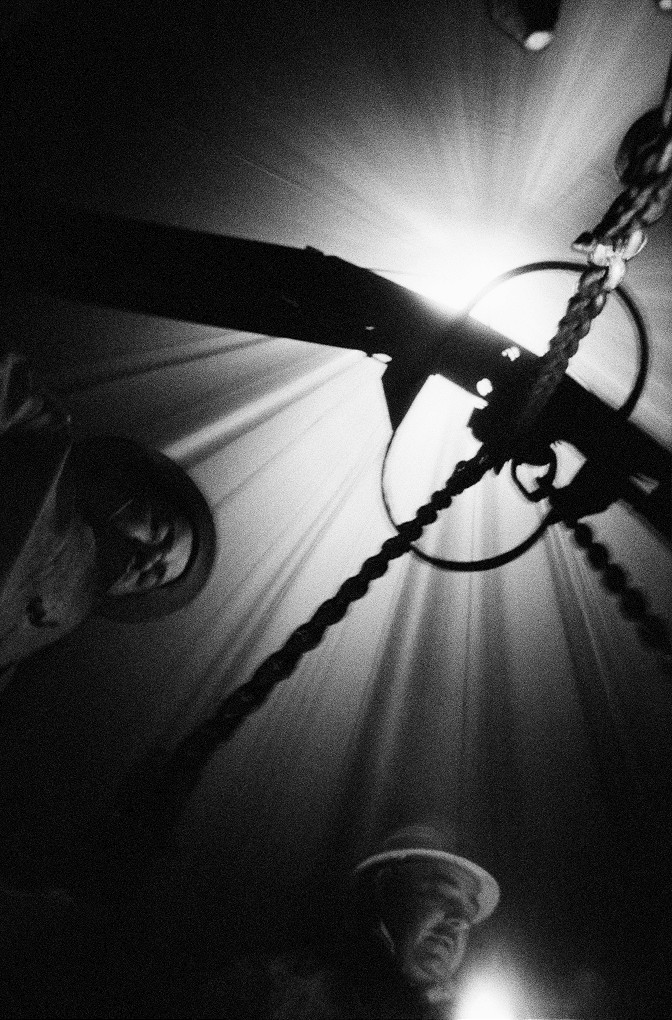 <p><b>David Goldblatt</b>, <i>In a kibble going down with Master sinker, Butch Britz (right). Pipes and cables in the shaft sides streaking past. Daylight disappearing above. In a moment big doors will cover the top of the shaft to prevent anything falling from the surface onto the men below.</i></p>