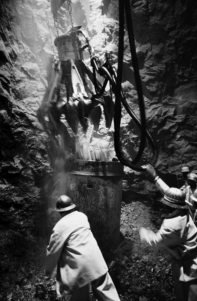 <p><b>David Goldblatt</b>, <i>Shaftsinking: the cactus grab has dumped the last load of big rocks in the kibble, now the men clear the smaller rocks from the bottom, lashing the kibble with shovels. President Steyn No. 4 Shaft, Welkom, Orange Free State</i>, June 1969.</p>