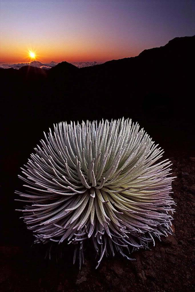 <p><b>Frans Lanting</b>, <i>Silversword at sunset, Argyroxiphium sandwicense, Mauna Kea, Hawaii</i>.</p>