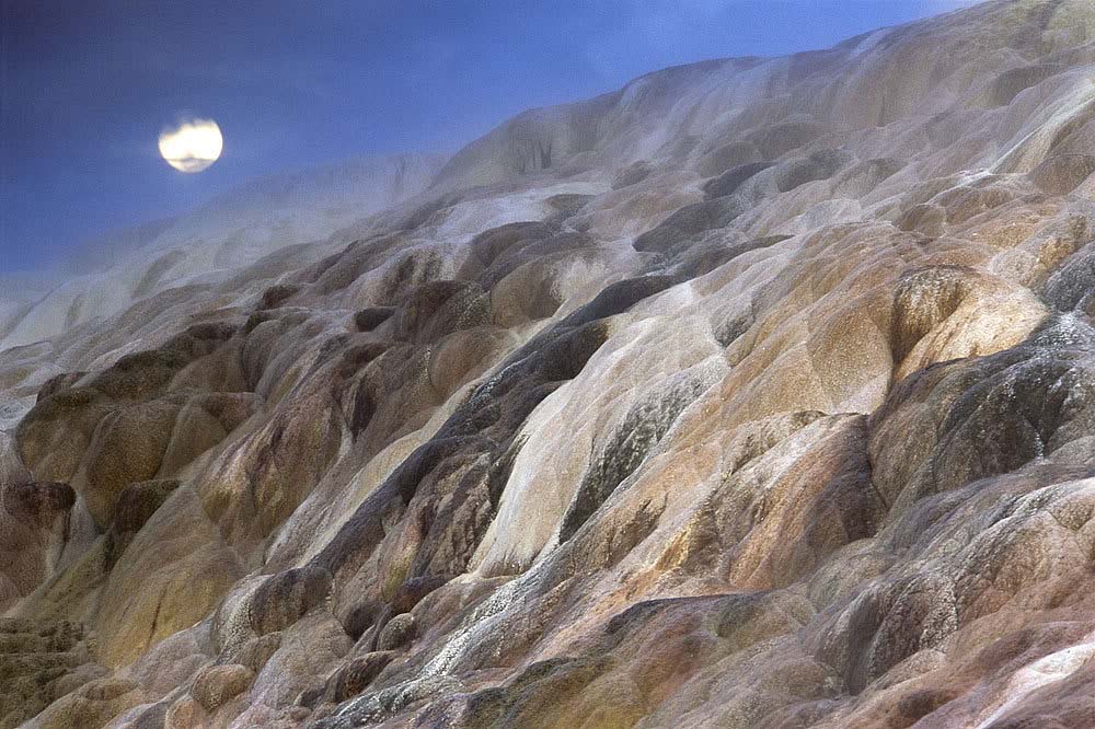 <p><b>Frans Lanting</b>, <i>Moonrise over mineral terraces, Yellowstone National Park, Wyoming</i>.</p>