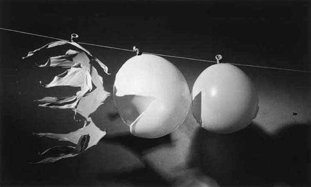 <p><strong>Harold Edgerton</strong>, <i>Bullet Through Three Balloons</i>, 1936, microflash.</p>