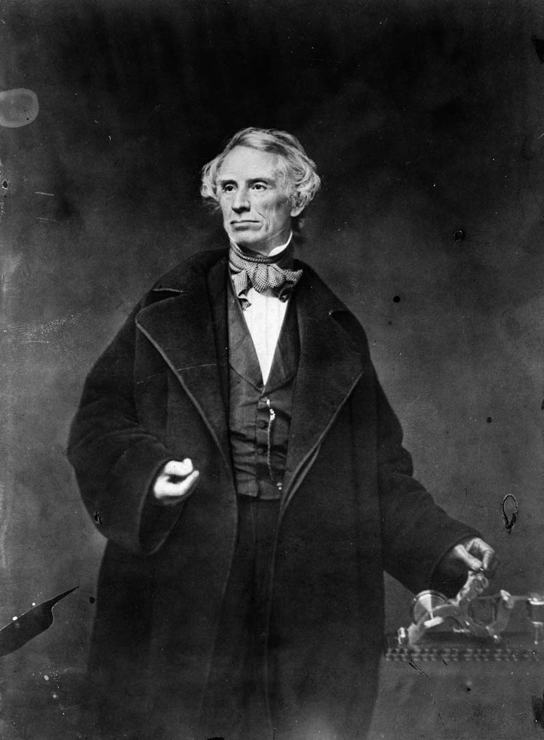 <p><b>Mathew Brady</b>, <i>Samuel F.B. Morse, half-length portrait, posing with left hand on a telegraph apparatus, facing slightly left</i>, c. 1850, photographic print from Brady negative</p>