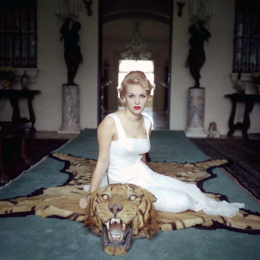 <p><b>Slim Aarons</b>, <i>Lady Daphne Cameron</i>, 1959. Mrs. George (Daphne) Cameron sits on a tiger pelt in the trophy room of Laddie Sanford’s Palm Beach house. © Slim Aarons</p>